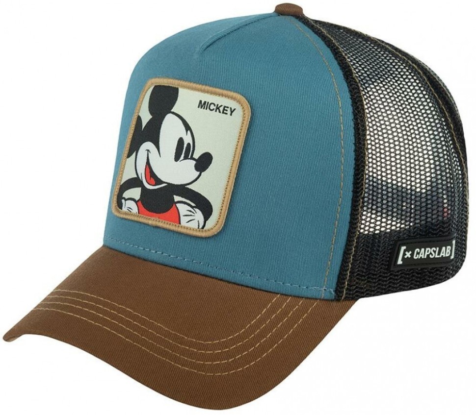 Бейсболка Mickey Mouse из коллекции Disney. Бейсболка с сеточкой сшита из хлопка двух цветов: передняя панель из голубого, козырек и пуговица из светло-коричневого. Черную сеточку украшает бежевая строчка. На бейсболке многоцветная нашивка с изображением Микки Мауса – обаятельным диснеевским героем. Сбоку на сеточке пришита миниатюрная белая перчатка Микки, сложенная в приветственном жесте шака – оттопыренные мизинец и большой палец. Размер бейсболки регулируется при помощи пластиковой застежки. Отличительные знаки бренда – резиновые ярлычки с логотипом и надпись Capslab на внутренних швах.