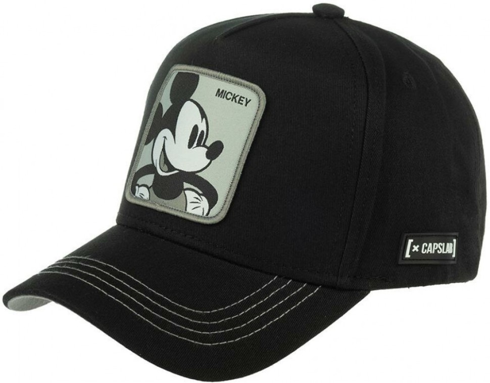 Классическая бейсболка Mickey Mouse из коллекции Disney. Черную хлопковую бейсболку украшает черно-белая нашивка с Микки Маусом и белая строчка на козырьке. Внутри козырек и швы выполнены из хлопка серого цвета. Сбоку на сеточке пришита миниатюрная белая перчатка Микки, сложенная в приветственном жесте шака – оттопыренные мизинец и большой палец. Размер бейсболки регулируется при помощи пластиковой застежки. Отличительные знаки бренда – резиновые ярлычки с логотипом и надпись Capslab на внутренних швах.