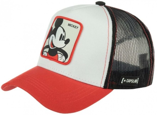 Бейсболка Mickey Mouse из коллекции Disney. Красно-бело-черную бейсболку украшает яркая нашивка с изображением Микки Мауса. Диснеевский герой появился на свет в 1928 году и часто встречается на одежде и головных уборах. Передний белый клин и черная сеточка отстрочены красной нитью. Сбоку на сеточке пришита миниатюрная белая перчатка Микки, сложенная в приветственном жесте шака – оттопыренные мизинец и большой палец. Размер бейсболки регулируется при помощи пластиковой застежки. Отличительные знаки бренда – резиновые ярлычки с логотипом и надпись Capslab на внутренних швах.