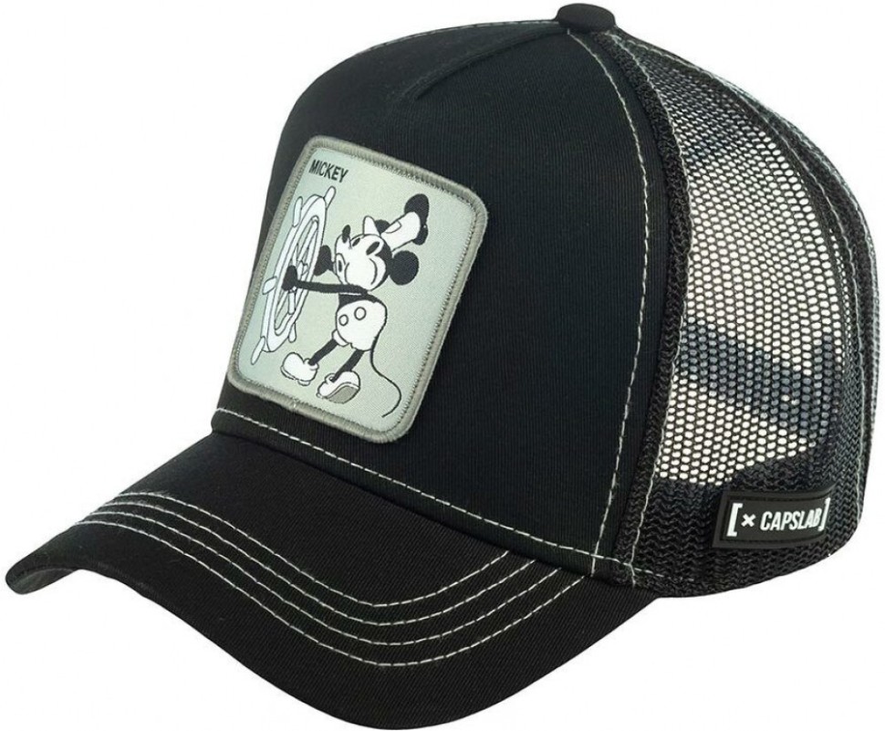 Монохромная бейсболка Mickey Mouse из коллекции Disney. Бейсболка сшита из черного хлопка. Строгую модель украшает черно-белая нашивка с Микки Маусом и белая строчка на козырьке. Диснеевский герой появился на свет в 1928 году и часто появляется на одежде и головных уборах. На нашивке изображен мышонок, который управляет кораблем, насвистывая веселую песенку. Сбоку на сеточке пришита миниатюрная белая перчатка Микки, сложенная в приветственном жесте шака – оттопыренные мизинец и большой палец. Размер бейсболки регулируется при помощи пластиковой застежки. Отличительные знаки бренда – резиновые ярлычки с логотипом и надпись Capslab на внутренних швах.