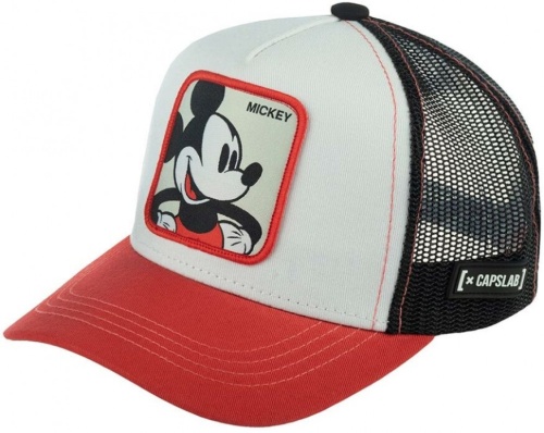 Детская бейсболка Mickey Mouse из коллекции Disney. Красно-бело-черную бейсболку украшает яркая нашивка с изображением Микки Мауса. Диснеевский герой появился на свет в 1928 году и часто встречается на одежде и головных уборах. Передний белый клин и черная сеточка отстрочены красной нитью. Сбоку на сеточке пришита миниатюрная белая перчатка Микки, сложенная в приветственном жесте шака – оттопыренные мизинец и большой палец. Размер бейсболки регулируется при помощи пластиковой застежки. Отличительные знаки бренда – резиновые ярлычки с логотипом бренда и надпись Capslab на внутренних швах.
