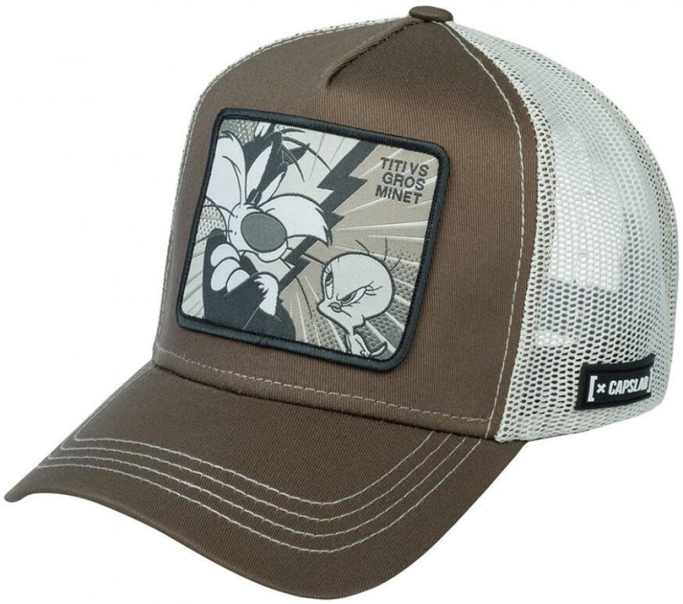 Бейсболка Tweety Pie vs Sylvester из коллекции Looney Tunes. Хлопковую коричневую бейсболку со светлой сеточкой украшает нашивка с изображением мультгероев: кот Сильвестр против канарейки Твити. Надписи дублируют имена героев по-французски: Grosminet (Громине) и Titi (Тити). В мультиках кот вечно занят поимкой канарейки, и сюдя по нашивке в виде пера на сеточке сбоку, он скоро добьется успеха. Размер головного убора регулируется при помощи пластиковой застежки. Отличительные знаки бренда – резиновые ярлычки с логотипом и надпись Capslab на внутренних швах. Длина козырька - 6,5 см, глубина бейсболки - 13 см.