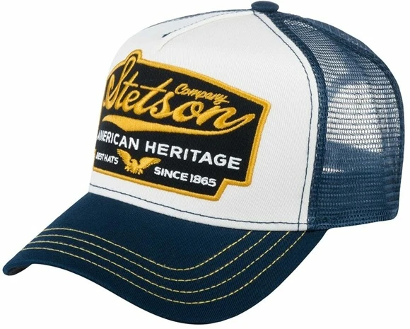 TRUCKER CAP AMERICAN HERITAGE от культового американского бренда Stetson. Тракерами бейсболки с сеточкой назвали в честь дальнобойщиков, которые носили такие головные уборы не только на работе, но и в повседневной жизни. Бейсболка выполнена из чистого хлопка синего цвета и прошита желтой и синей строчками. На передней панели – патч с вышитыми надписями STETSON American Heritage («Американское наследие»), Best hats since 1865 («Лучшие головные уборы с 1865 года»). Размер головного убора регулируется с помощью пластиковой застежки. Длина козырька - 7 см, глубина - 12 см. Для комфортной посадки внутрь вшита хлопковая лента, на ней – фирменная нашивка с названием бренда.
