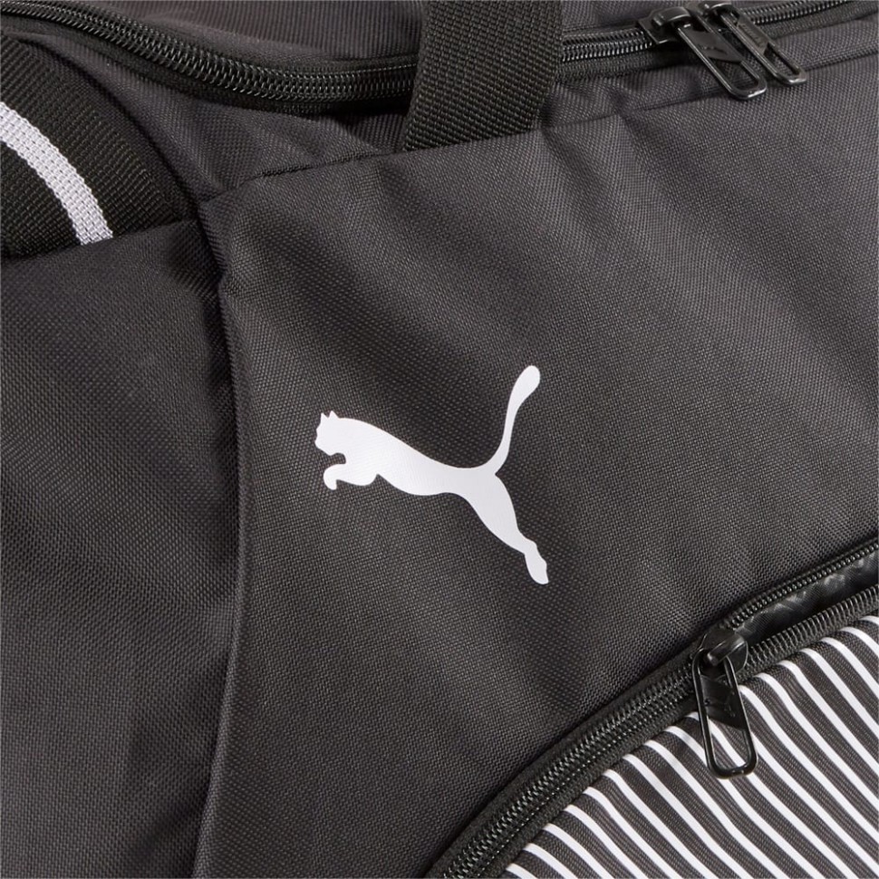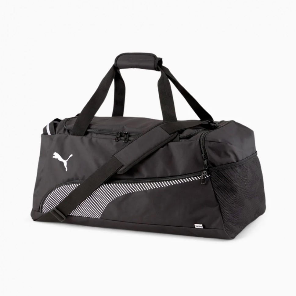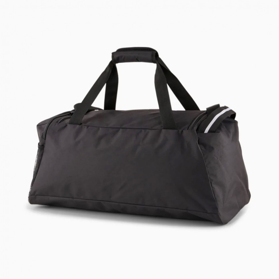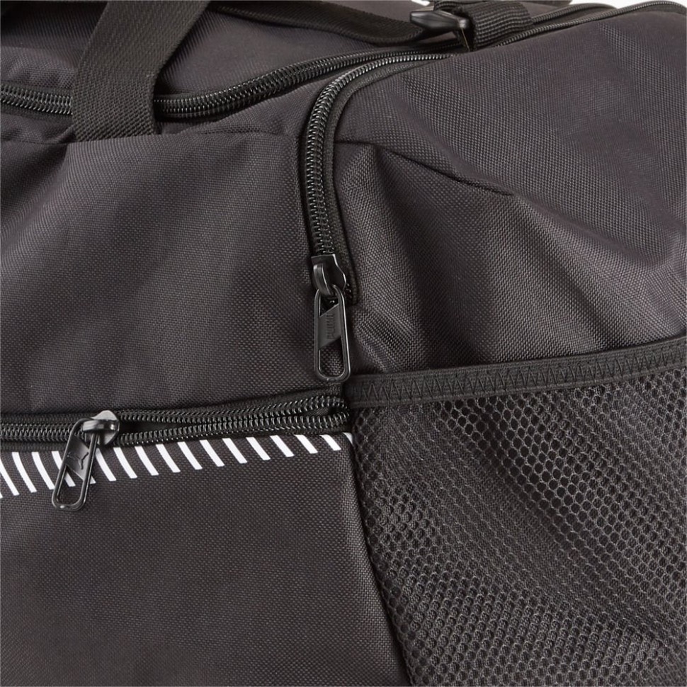 Теперь у вас есть все необходимое для тренировки! Не ждите, начните прямо сейчас! Просто разложите вещи по отделениям и приступайте. Основное отделение с брендированной подкладкой из полиэстера плотностью 150D и уплотнителем из полиуретана закрывается на двустороннюю молнию. Внутри основного отделения имеется карман на подкладке с застежкой-молнией. Сумка имеет передний и боковой карман на молнии, боковой сетчатый карман. Тканевые ручки удобно ложатся в руку, а съемный плечевой ремень регулируется по длине и имеет специальную подкладку-наплечник. Дно сумки имеет мягкую подложку. Брендированные металлические пуллеры на основном и боковых отделениях придают сумке стильный вид. Передняя панель декорирована светоотражающей лентой с надписью PUMA, крупной фирменной полоской и принтом с символикой PUMA Cat.